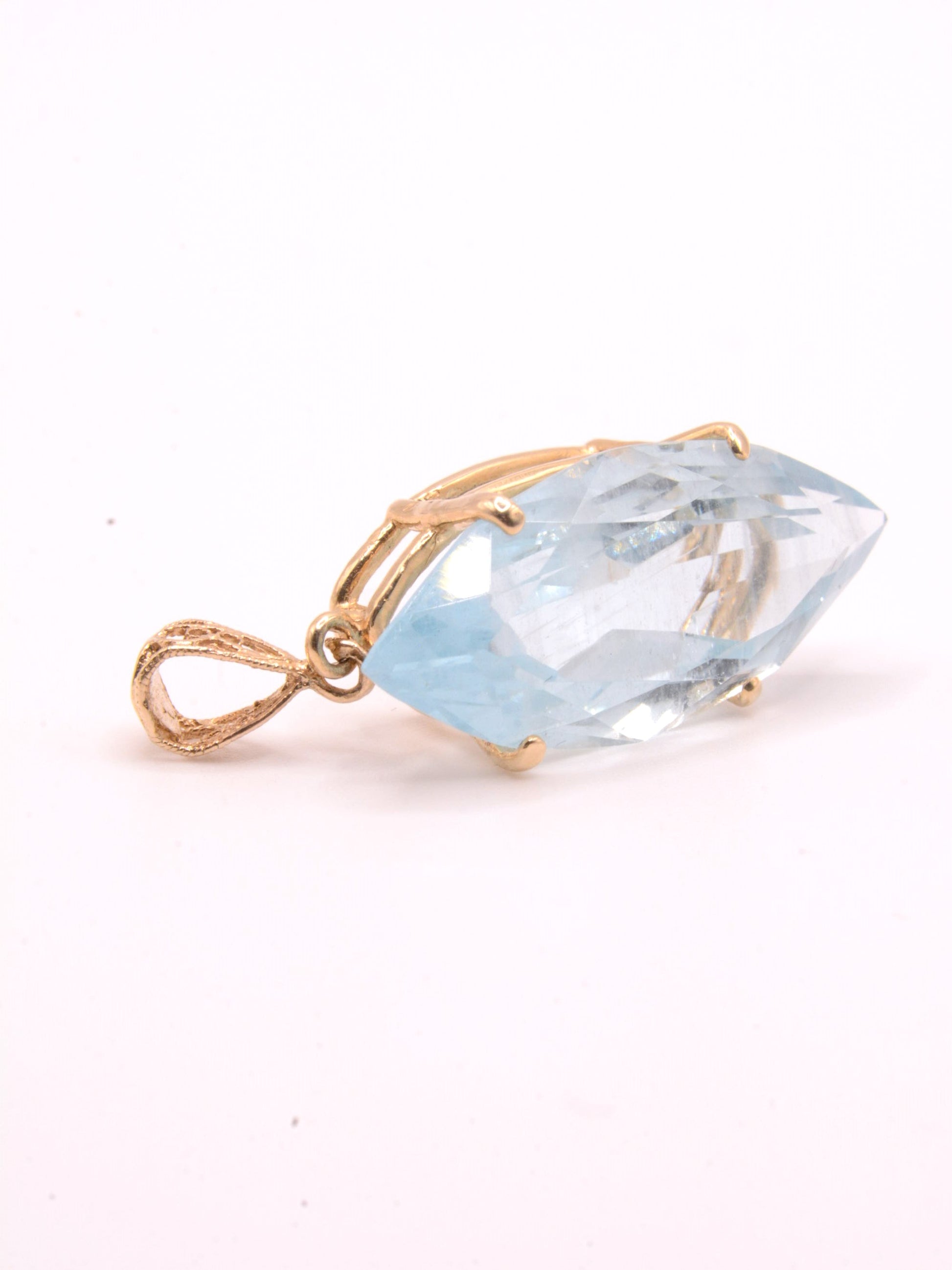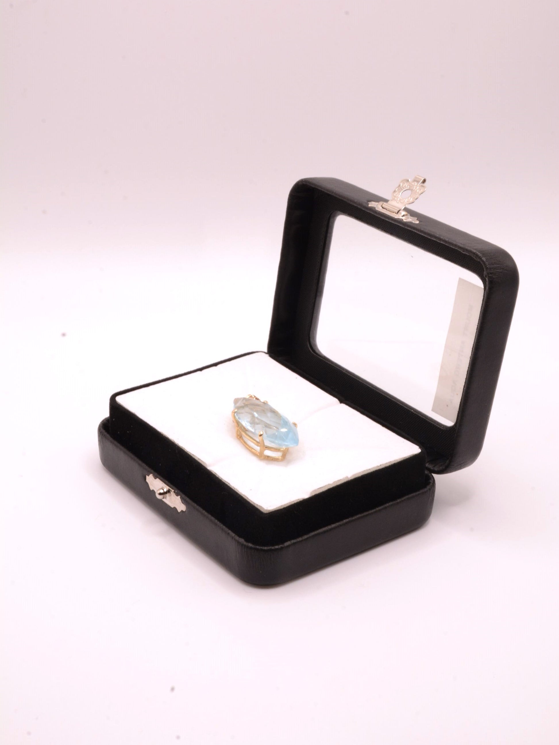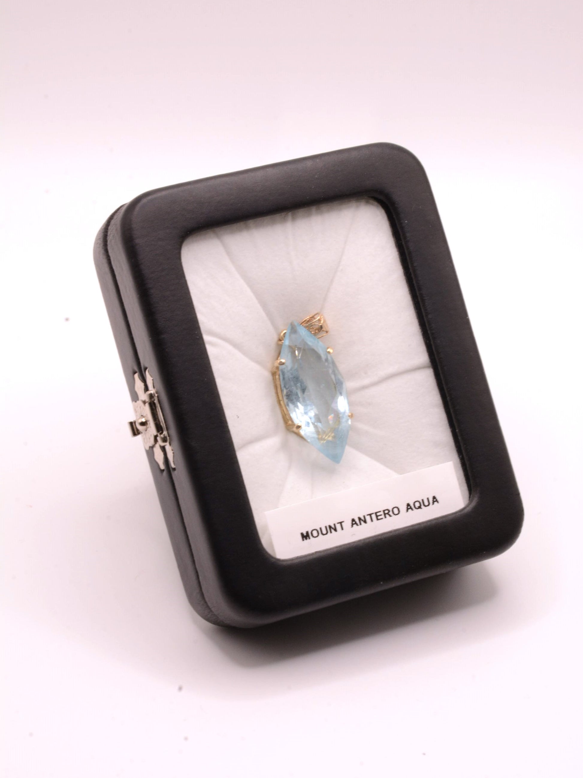 A large stone cut from Mt. Antero aquamarine elegantly set in 14k gold.